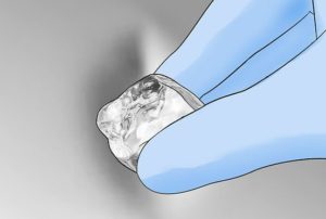 Далі до вм'ятині прикладається сухий лід, його можна купити в аптеці. Краще обернути шматочок в тканину із замші, щоб захистити оброблювану поверхню від подряпин. Круговими рухами здійснюють обробку ділянки протягом хвилини, після чого ганчірку з сухим льодом прибирають.