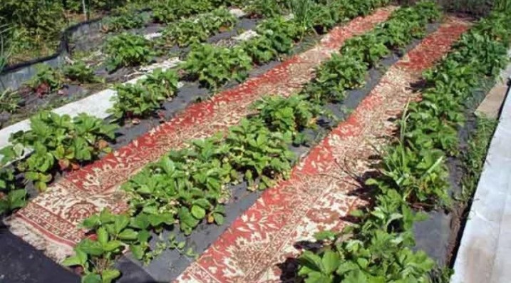 Якщо килим зносився досить сильно, то його можна нарізати на смужки, і постелити між грядками на городі. Працювати буде набагато комфортніше, адже у вузьких траншеях не будуть накопичуватися бруд і вода.