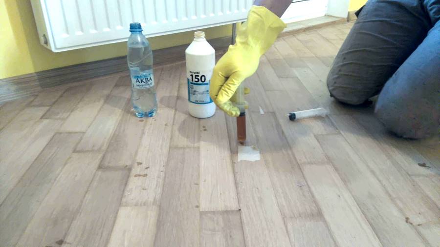 В ситуації, коли «стогнуть» лише окремі елементи покриття, можна вирішити питання без зняття ламінату. Для того щоб позбутися від сторонніх звуків досить просвердлити в проблемній зоні наскрізний отвір і через нього за допомогою шприца ввести під ламель клей ПВА (скільки поміститься). Через 2 дні, протягом яких наступати на дефектну область не можна, склад підсохне і скрип зникне. Залишиться лише замаскувати отвір спеціальною затіркою для ламінату або шпаклівкою по дереву відповідного відтінку.