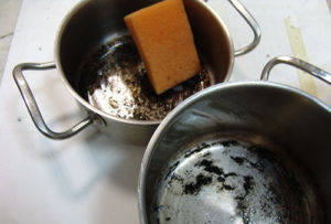 Для приготування цього розчину знадобиться містка ємність. В ній потрібно змішати чотири літри води, одну третину шматка господарського мила, подрібненого на тертці і додати столову ложку клею ПВА. У приготовлений склад потрібно занурити каструлю і піддати кип'ятіння протягом тридцяти хвилин. Цей спосіб видалить дуже старий бруд.
