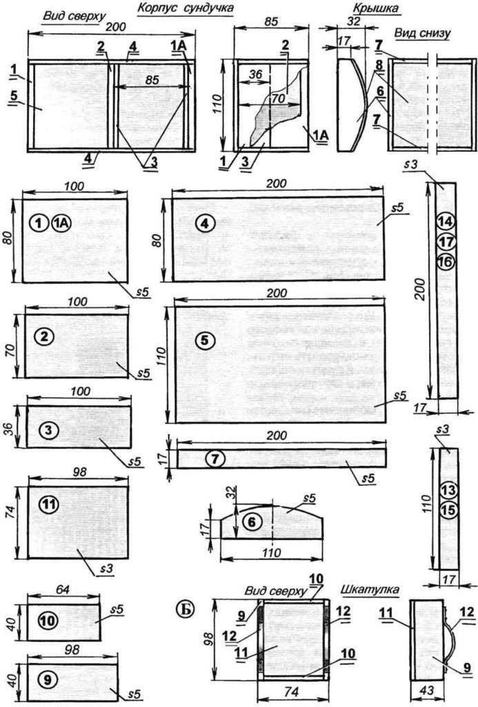 - Випиляєте з фанери деталі: бічні стінки, підстава, кришку.