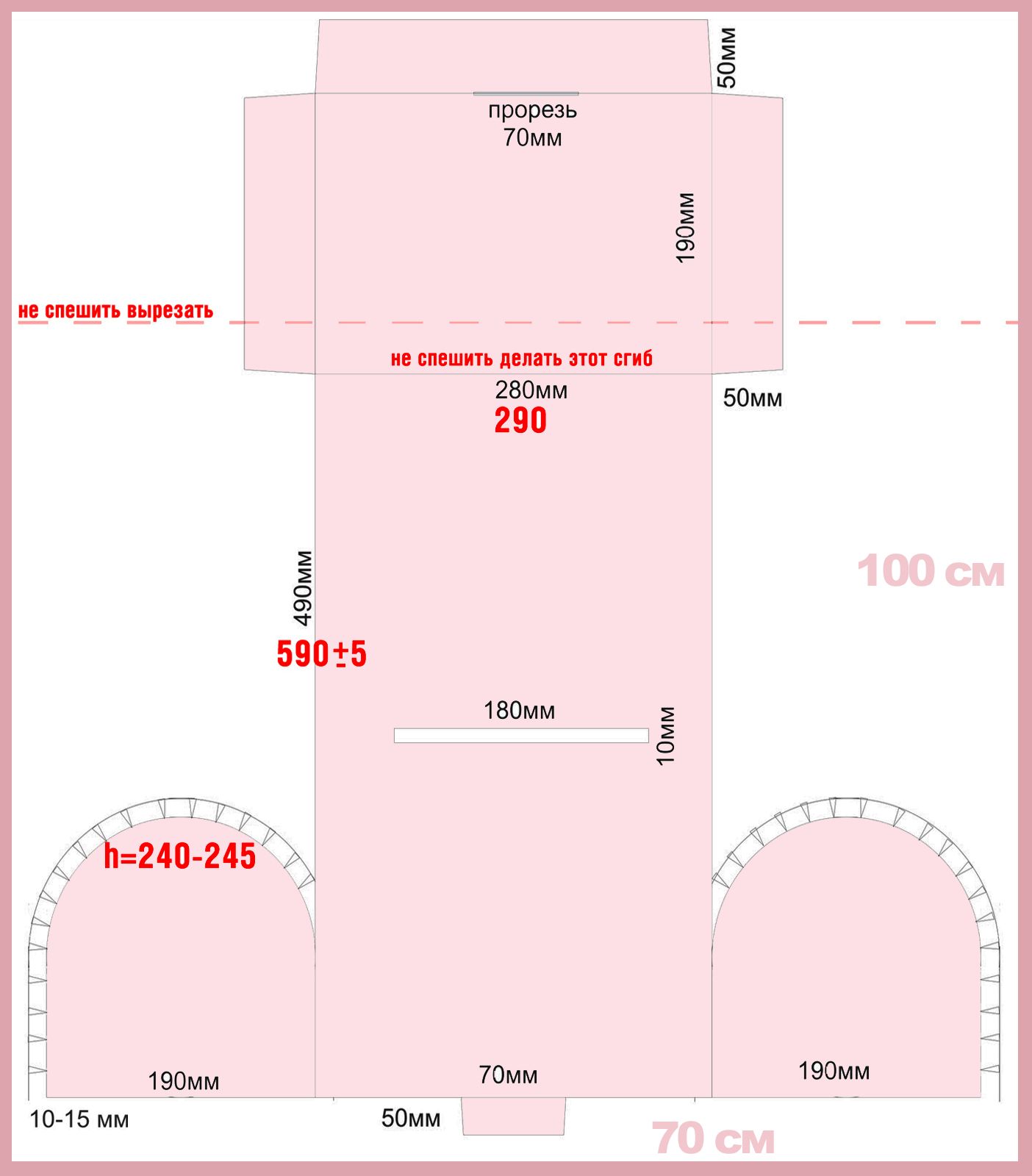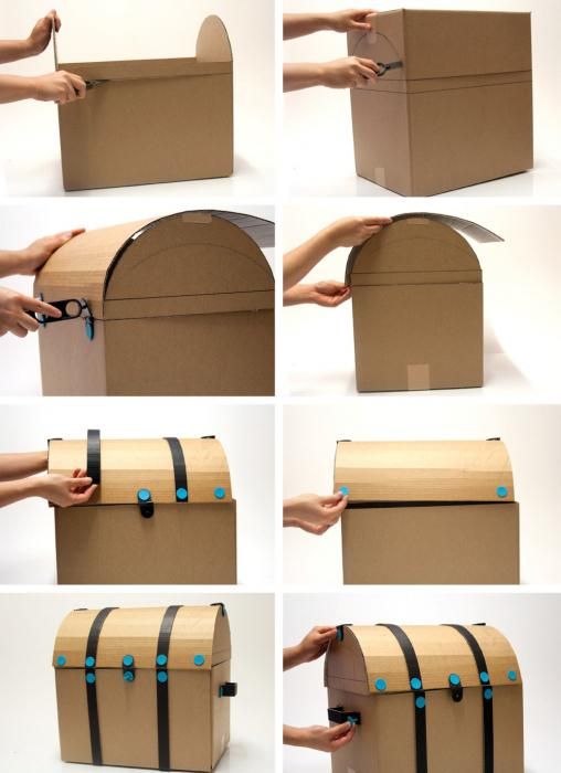 Починаючи роботу, потрібно розкреслити коробку або аркуш картону так, щоб верхня частина вийшла напівкруглої і нагадувала за формою скриня. Для цього потрібно: