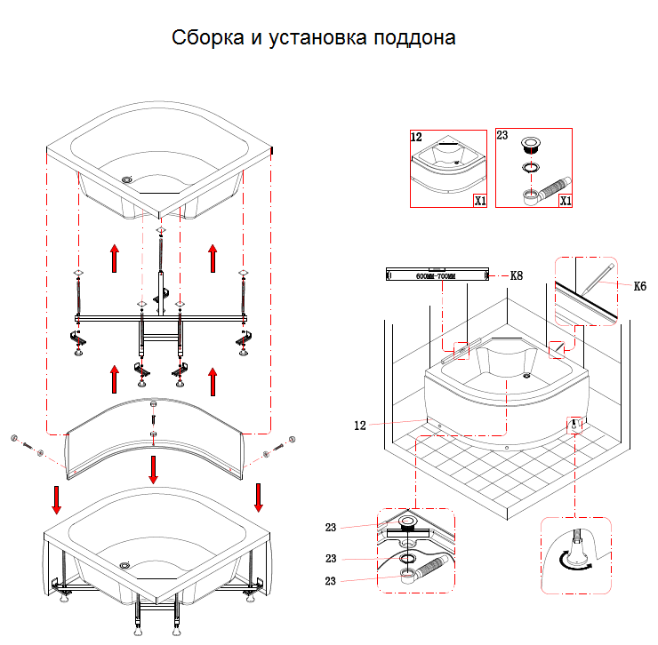 - В кінці установки піддону треба перевірити роботу зливу. Переконайтеся, що герметична конструкція і шланги потрібної довжини для підведення каналізації.