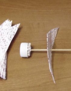 Тепер залишається зробити підставку для ялинки. Для цього кришку потрібно приклеїти до картону, а з середини протягнути вгору дріт, яка стане підставою іграшки. Після цього можна починати нанизувати деталі і намистини на дріт в такому порядку, який вам подобається.