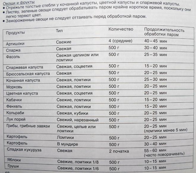 Як вже було сказано вище, за допомогою мультиварки і її режиму пароварки їжа готується дуже швидко. Тут буде запропонований список з продуктів і їх точний час приготування (вказується в хвилинах). Ви можете брати абсолютно будь-яку кількість продуктів, перелік є звичайним шаблоном.