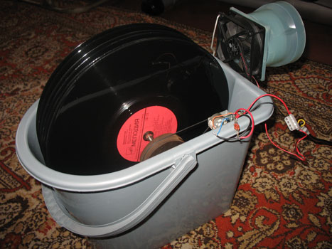 - У великий, ємністю на 10-20 літрів, поліетиленової пляшки зрізаємо горло, щоб до неї можна було прикріпити кулер від комп'ютера. Кріпимо кулер, за допомогою старого комп'ютерного блоку живлення подаємо на нього 12 вольт. По боках пляшки, приблизно 7-10 сантиметрів від верху, робимо отвори для виходу повітря. Наливаємо воду трохи нижче рівня отворів, за допомогою скотча кріпимо кулер на горлечко пляшки. Включаємо БЖ в розетку – пристрій починає функціонувати. Плюси – простота і ефективність пристосування, мінус – не дуже акуратний у розумінні естетики дизайн, необхідність щоразу від'єднувати кулер при заправці ємності водою.
