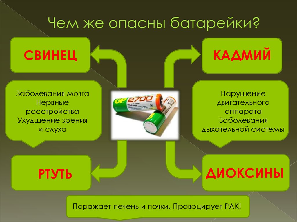 Наприклад, ртуть у складі батареї з часом перетворюється в метилртуть і потрапляє в організм людини. Накопичуючись, вона призводить до відмирання нирок та блокування роботи ниркової системи.