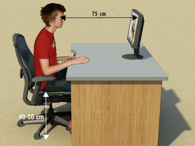 Звичайно, щоб знизити вплив на очі при роботі з обладнанням, необхідно правильно організувати положення.