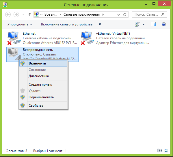 - У вікні звернути увагу на колір значка бездротового мережевого з'єднання. У разі, якщо такий значок не підсвічений або відображається чорно-білим, то варто клацнути по ньому правою клавішею миші та активувати підключення, клацнувши по відповідному пункту контекстного меню.