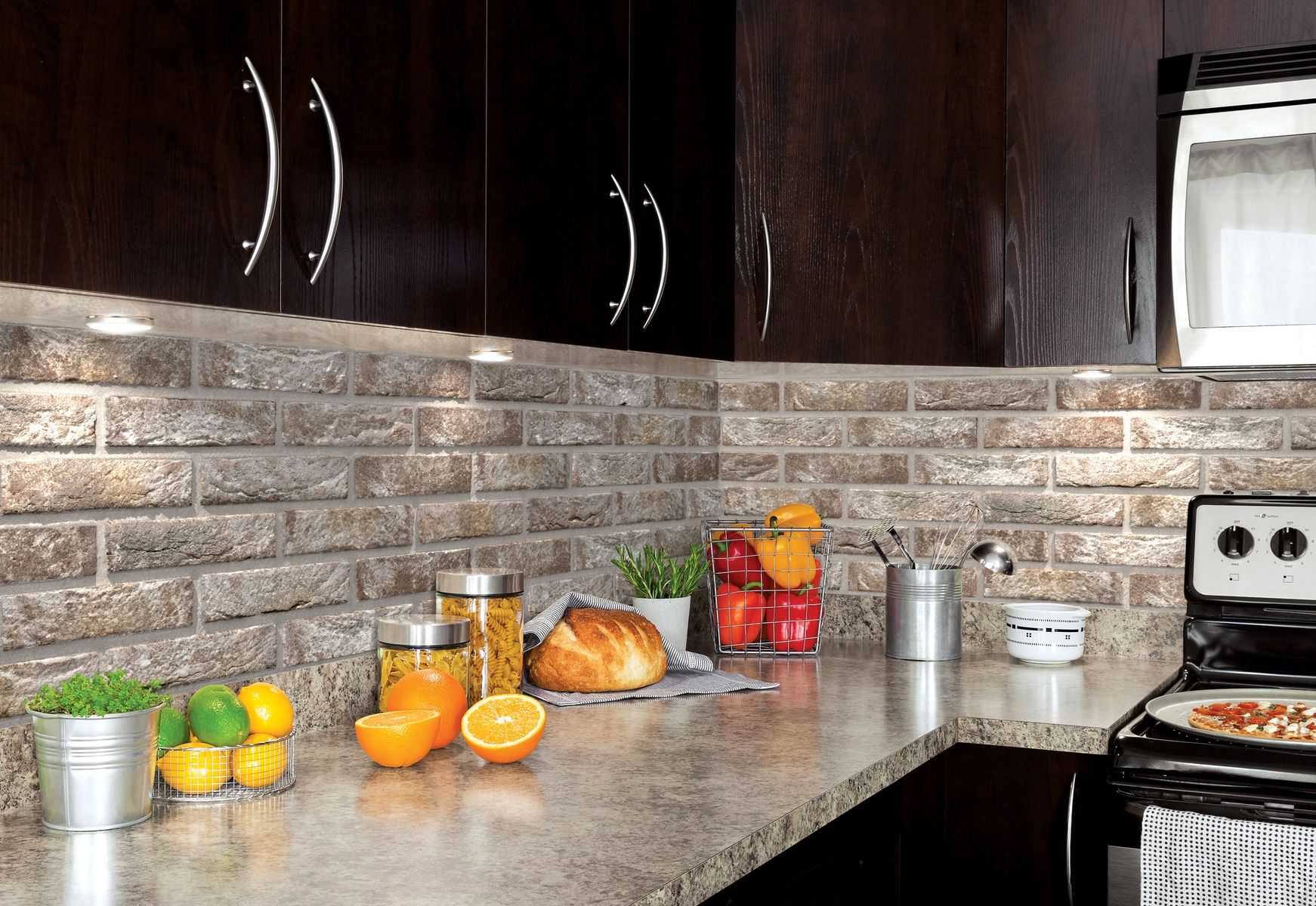 Природний і штучний камінь не так часто застосовуються при обробці фартуха. Цей матеріал здатний зробити вашу кухню неповторною.