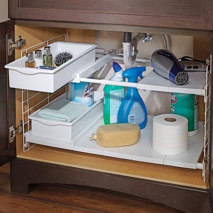 Обладнати місце можна під раковиною. У шафі краще розмістити пластмасову етажерку, на якій можна розвішувати дрантя і розміщувати інші засоби побутової хімії.