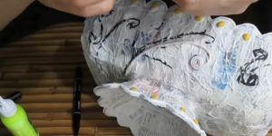 - Тепер обклеїти газетами потрібно і шийку. Почекати поки обидві заготовки висохнуть, і приклеїти горлечко в якості підставки до майбутньої хлібниці гарячим клеєм.