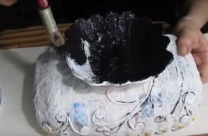 - Нехай все добре висохне, тільки потім можна приступати до фарбування виробу. На фото хлібницю фарбують чорним кольором, але ви можете вибрати будь-які кольори, які будуть гармоніювати з вашою кухнею.