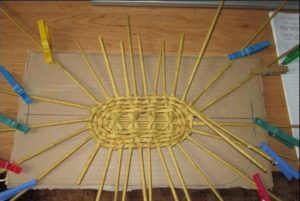 Знайдіть підходящу основу, і закріпіть за допомогою прищіпок, далі продовжуйте процес плетіння по колу. Пізніше вам знадобиться піднос, тому що необхідно буде зробити хлібницю овальної форми.