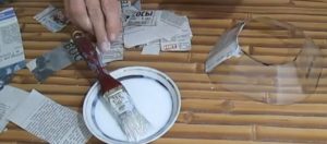 - Наступний етап, це підготовка газети. Її потрібно нарізати смужками, розвести клей 1:2. Необхідно двічі обклеїти заготовку з пластикової каністри газетними смугами з обох сторін.