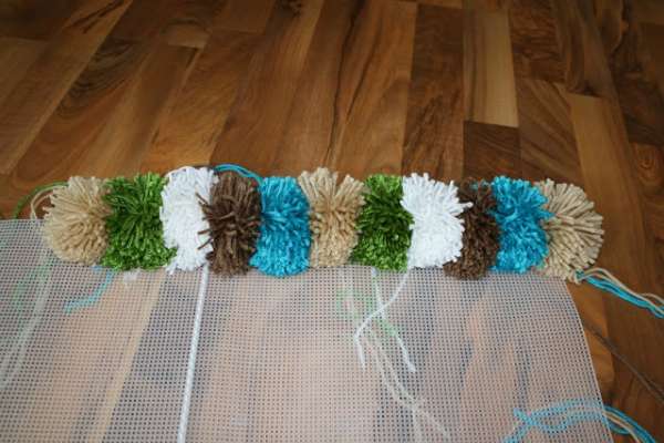 Тією ниткою, якою ви пов'язували помпон необхідно прив'язати його до основи. Робіть це поступово, по черзі прив'язуючи кульку за кулькою. Для зручності можна використовувати велику голку.