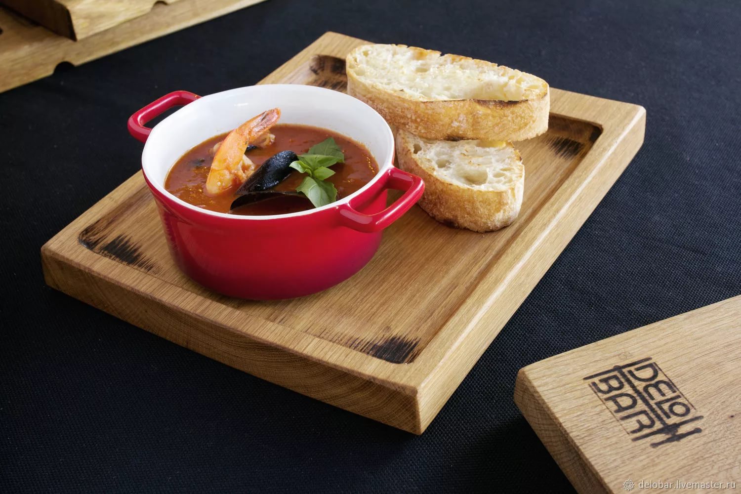 З вигляду ці підставки дуже нагадують незмінний атрибут будь-якої кухні — обробну дошку. Там можуть бути спеціальні виїмки під ємності з соусами.