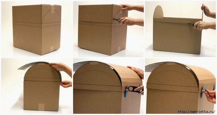 Далі, необхідно буде вирізати круглі торці, а також частина стінок. З тонкого картону виріжте прямокутник і приклейте його зверху. Ось, власне, ви і зібрали кришку скрині. Для міцності шви конструкції можна обклеїти з обох боків за допомогою скотча, також можна проклеїти їх папером.