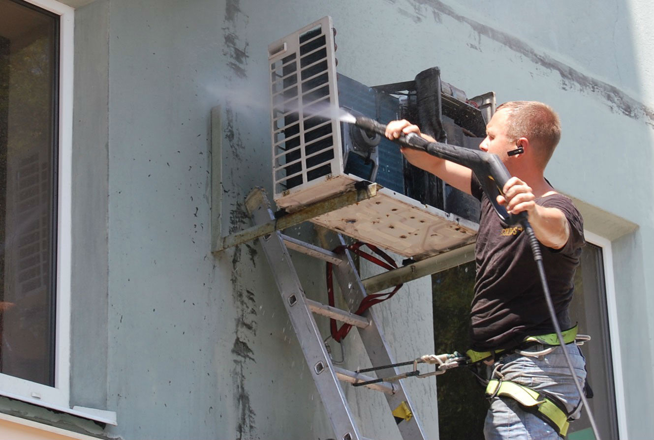 Зовнішній блок розташовується з боку вулиці, тому до нього необхідно підібратися. Можна використовувати сходи, спробувати дістати через відкрите вікно або з балкона.