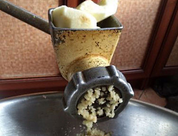 - Через агрегат пропускаємо яблука кислого сорту, кількість береться в залежності від габаритів м'ясорубки. Утворену кашку викладаємо в ємність, потім опускаємо туди м'ясорубку, замочуємо на кілька годин.