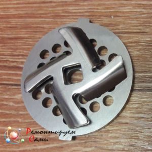 - Ніж, перемалывающий все, що потрапляє в мясоприемник. В центрі є квадратне отвір для надягання на шнек. Може бути з чотирма ріжучими лопатями або дискового типу. Важливо встановлювати ніж коректно, щоб механізм не заклинило.