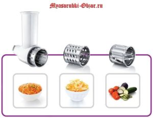 - Для шинкування і терки являють собою окремий (частіше з пластику) лоток з робочою камерою. У нього встановлюються змінні обертаються стаканчики, при цьому основний лоток і мясоприемник не використовують. Стаканчиків зазвичай буває 3-4 (один для шинкування і 2-3 різних терки).