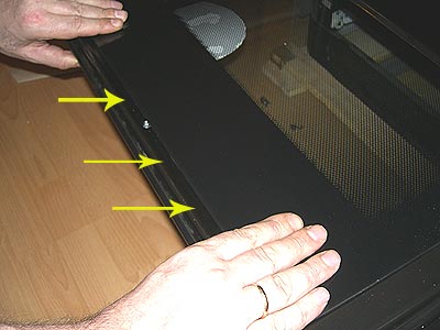 - Акуратно нанести лей на місця склеювання внутрішнього скла. Поставити його на місце, перевернути дверцята уклавши його на тверду рівну поверхню. Так, щоб скло не відходила від місця склеювання. Потім промазати місця склеювання на іншій стороні і встановити друге. Для надійності можна використовувати обважнювачі. Витерти серветкою видавлені під вагою залишки клею.