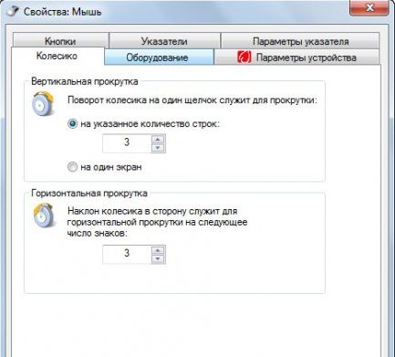 Для перегляду параметрів необхідно через «Панель управління» перейти в розділ мишки. У діалоговому вікні «Властивості: Миші» на вкладці «Коліщатко» переглянути параметр кількість рядків при вертикальному і горизонтальному прокручуванні. Кожен користувач значення цього параметра налаштовується індивідуально, оскільки комусь комфортно прокрутити одним рух половину сторінки, а іншого достатньо по одному рядку.