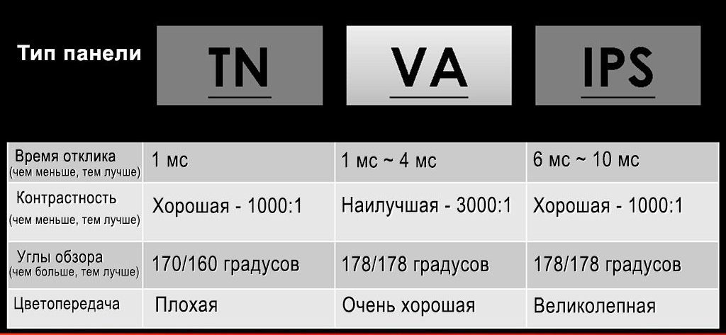 - MVA/VA характеризується високим кутом огляду, поліпшеним контрастом кольору. З мінусів виділяється довгий час відгуку. Любителям динамічних ігор від такого типу краще відмовитися.