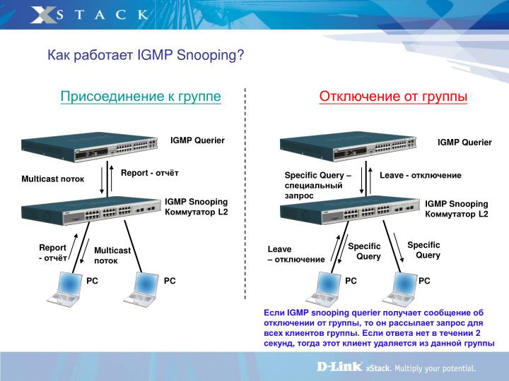 - Активне відстеження. Не лише пасивно слухає трафік, але і фільтрує його з метою ефективного використання мультивещания в мережі. Активний IGMP snooping мінімізує обмін інформацією, відсіваючи запити до роутера на підключення і відключення. Ідеальний стан комутатора – наявність одного споживача на кожну мультикастовую групу мовлення, до чого прагне алгоритм протоколу.