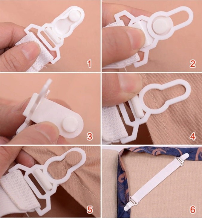 Принцип роботи фіксаторів простий. У звичайний комплект входять чотири пристосування. Тасьма протягується під низ матраца, а затиски прищипують за краї білизни недалеко від кутів.