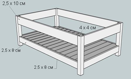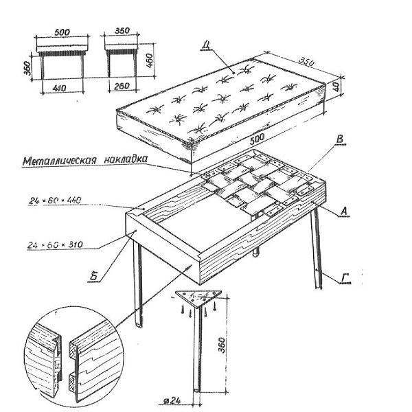 Складання каркаса потрібно почати зі складання верстата з заготовок і з'єднання їх за допомогою саморізів. Заздалегідь створений днище прикріплюється на каркасну основу. Потім за допомогою морилки робиться забарвлення конструкції з внутрішньої частини.